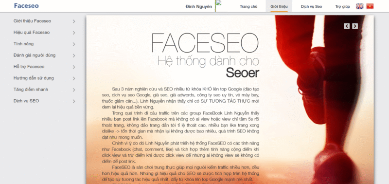 Faceseo là hệ thống “tăng traffic user (view link thật)” do CEO Linh Nguyễn phát triển. Hệ thống này hỗ trợ tăng traffic thật, giúp mô phỏng hành vi người dùng như tìm kiếm, truy cập, click vào website và đọc nội dung. Nhờ đó, Faceseo giúp Google nhận thấy website có lượng tương tác tự nhiên, từ đó cải thiện thứ hạng từ khóa hiệu quả. Ngoài ra, nền tảng này còn có cộng đồng người dùng lớn, giúp chia sẻ và trao đổi lượt truy cập, mang lại tín hiệu hành vi ổn định và an toàn.