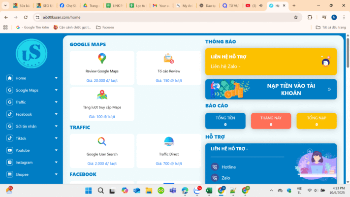 500kuser là một trong những hệ thống SEO USER hàng đầu tại Việt Nam. Nổi bật nhờ khả năng bơm traffic tự nhiên từ người dùng thật và mô phỏng hành vi truy cập giống người thật. Nền tảng này cho phép website nhận được lưu lượng truy cập ổn định, IP đa dạng, thời gian on-site cao. Giúp Google đánh giá website uy tín và cải thiện thứ hạng từ khóa nhanh chóng.